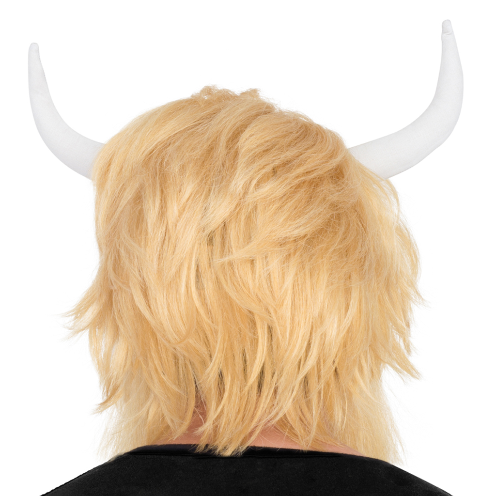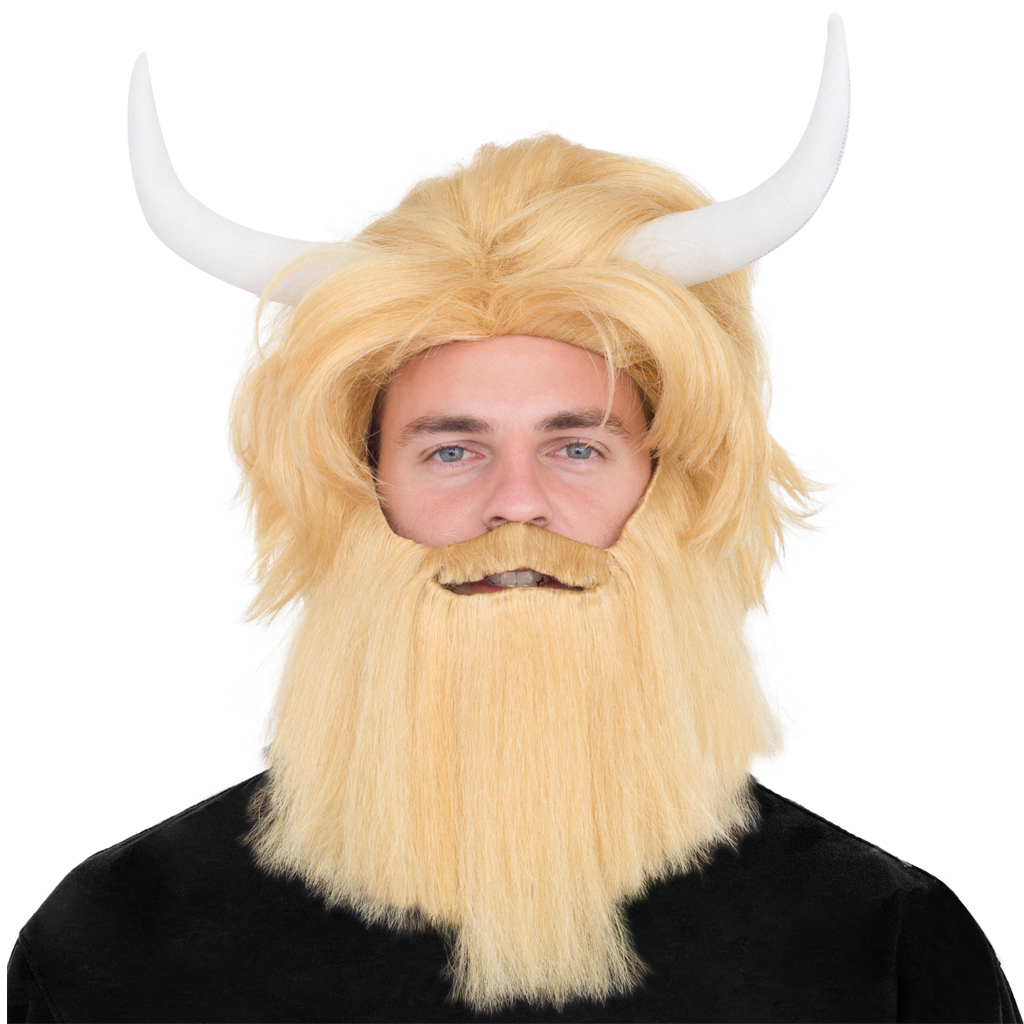 Includes: A wig with attached horns and a beard. The beard is attached with elastic bands.