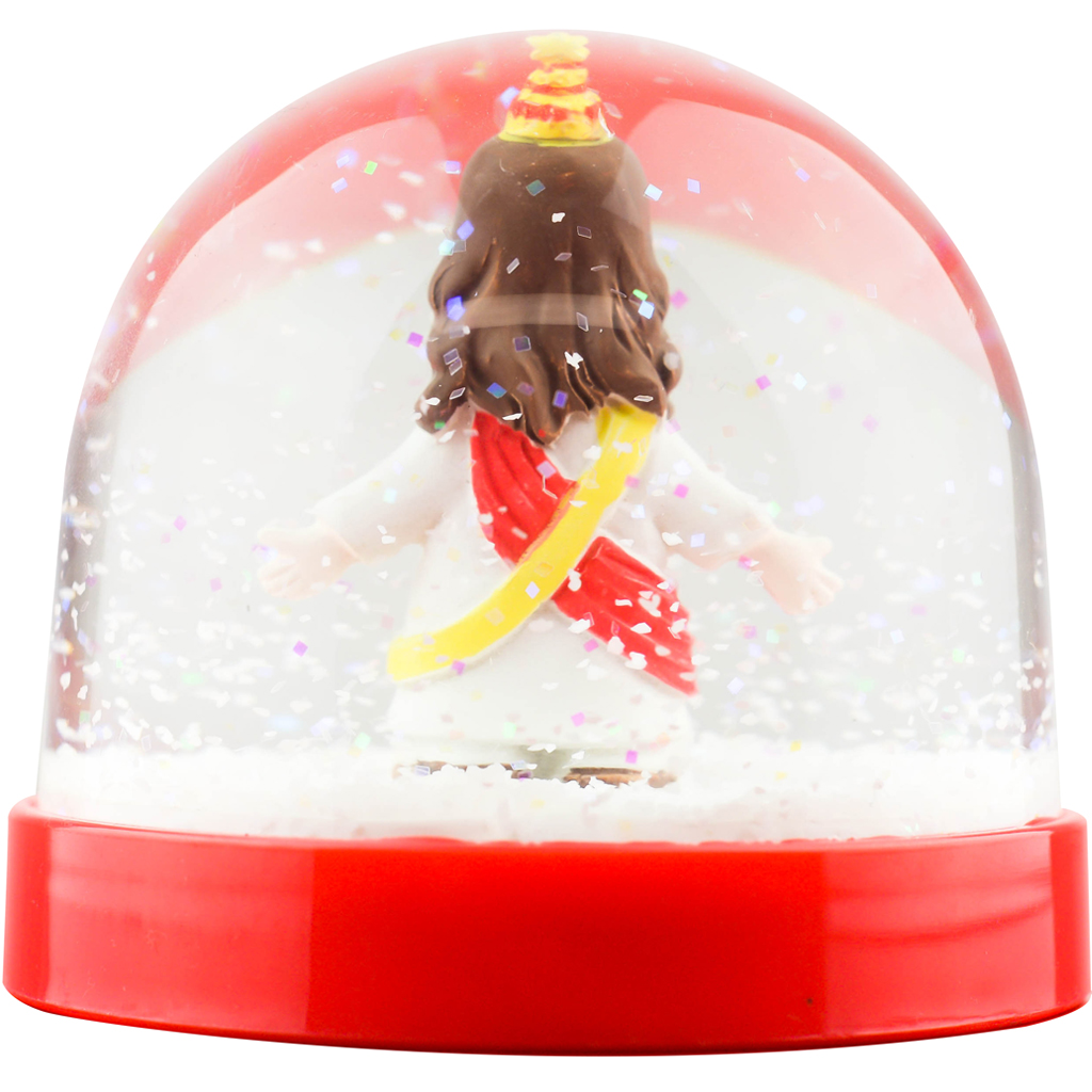 Includes: A plastic snow globe filled with water and glitter for snow.