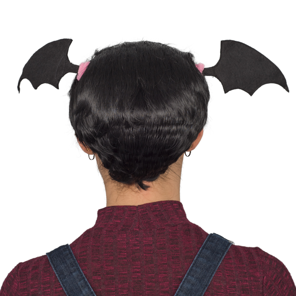 Includes: A short black wig with tied on faux bat wings.