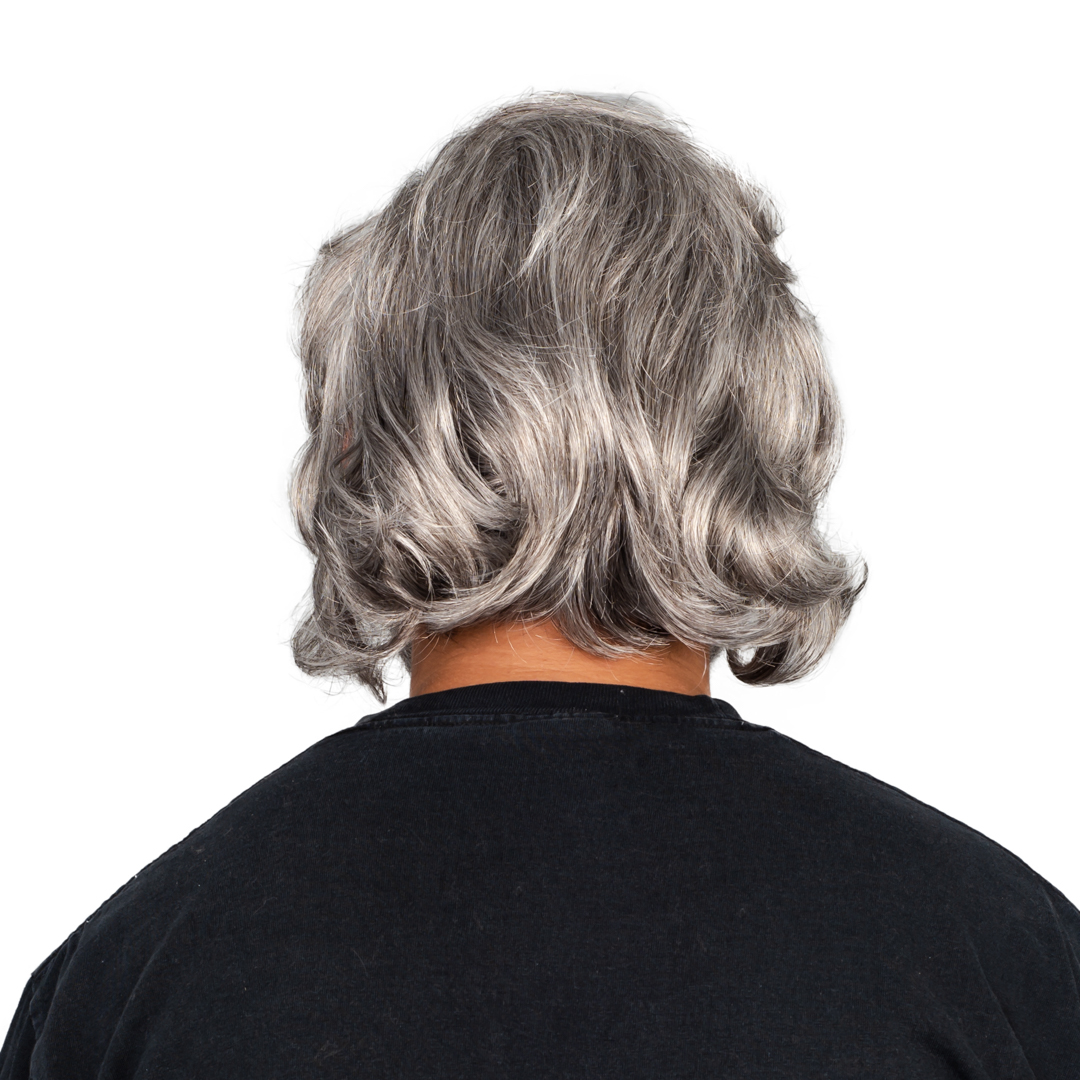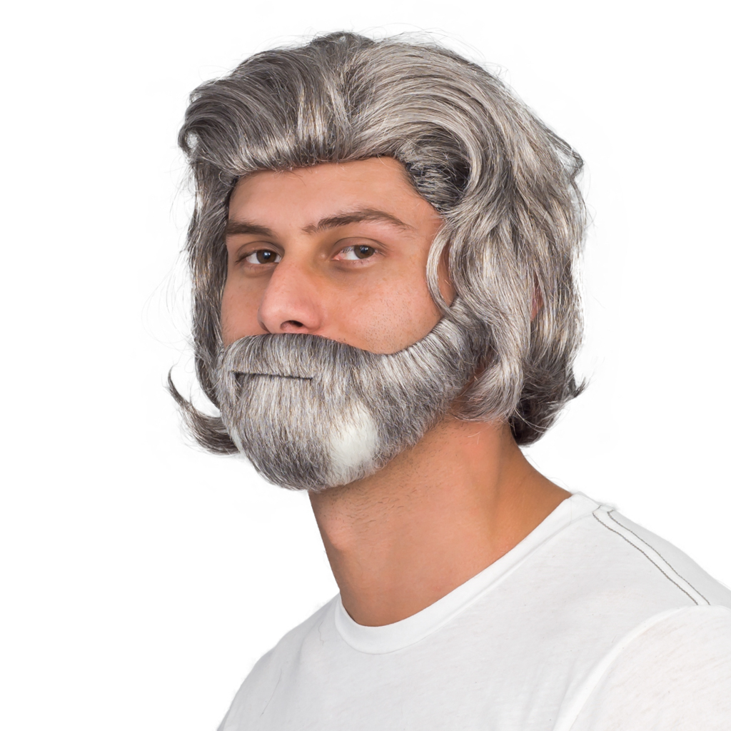 Includes: A mid length gray wig and full beard set. Facial features