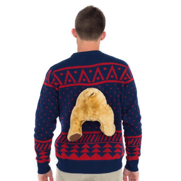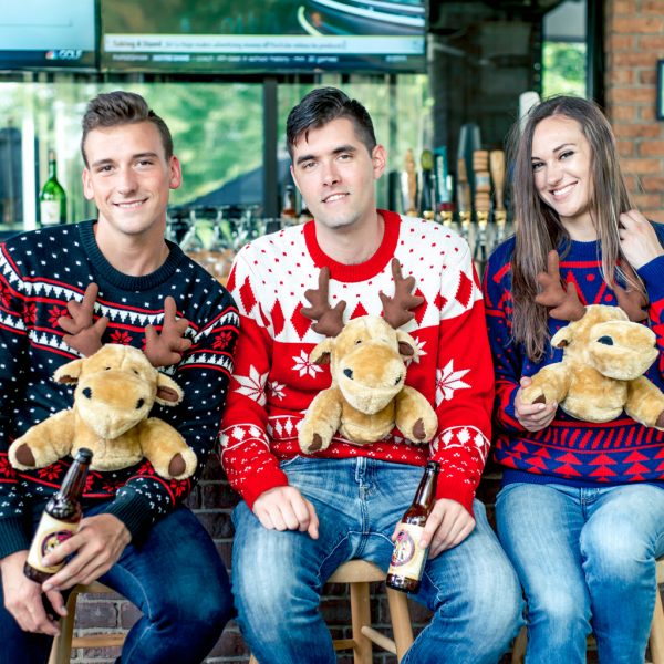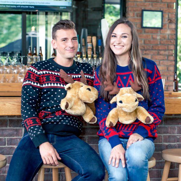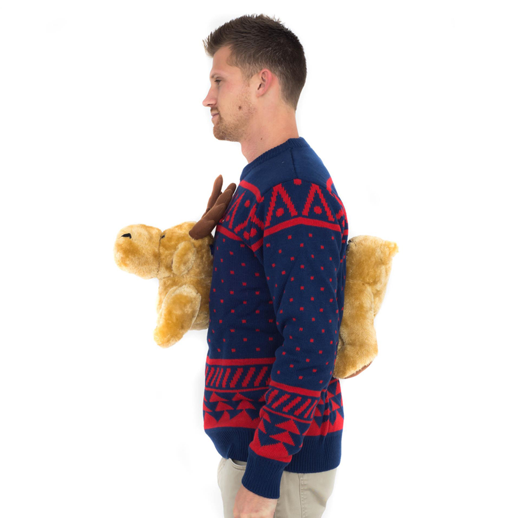 Includes: An adult unisex knitted ugly Christmas sweater with plush moose front and back.