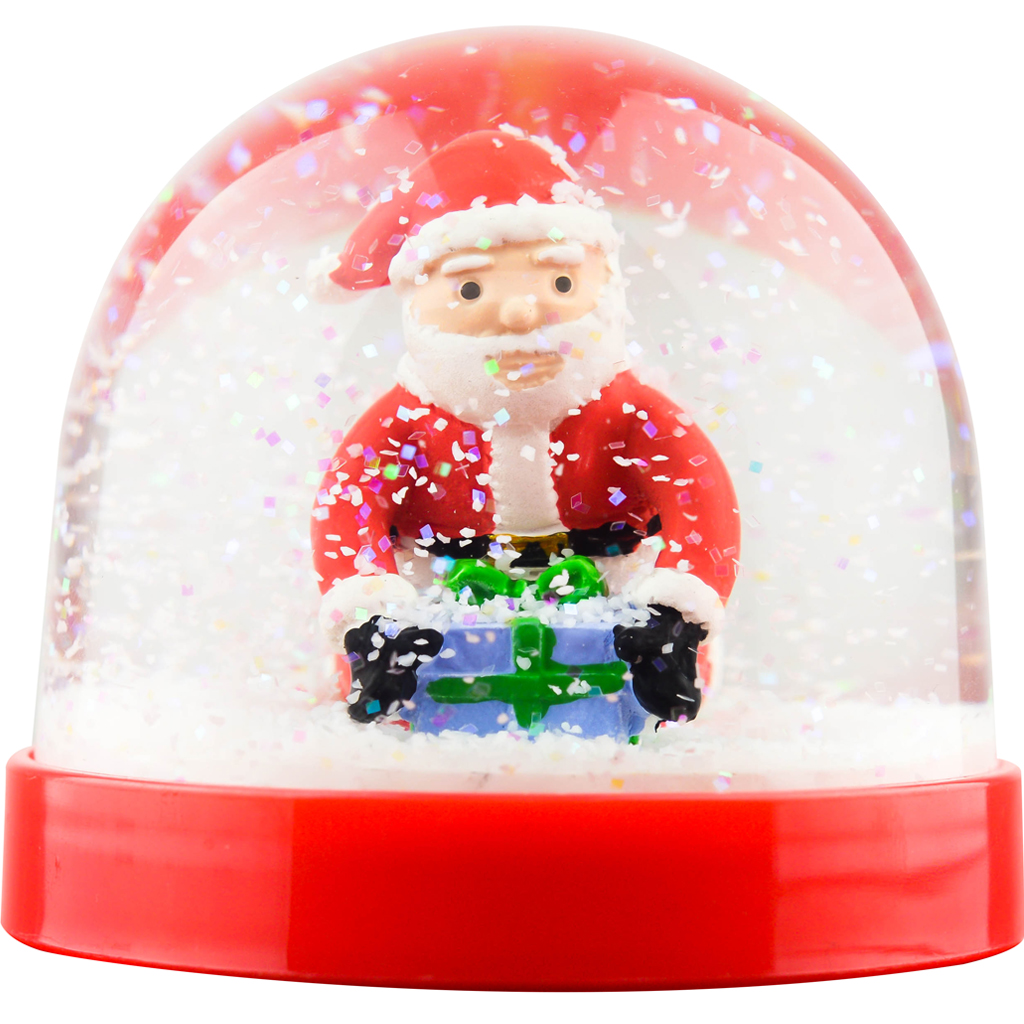Includes: A plastic snow globe filled with water and glitter for snow.